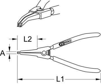 30° angled with dip-coated handle Self-closing pliers head with recess and ring holder for mounting and dismantling wave retaining rings without mounting eye Chrome vanadium Areas of application / for: For dismantling the outer (wheel side) joint when replacing the axle boot and/or gearbox seal. e.g.: on Audi, Opel, Volkswagen (Golf, T4), Fiat, Mitsubishi